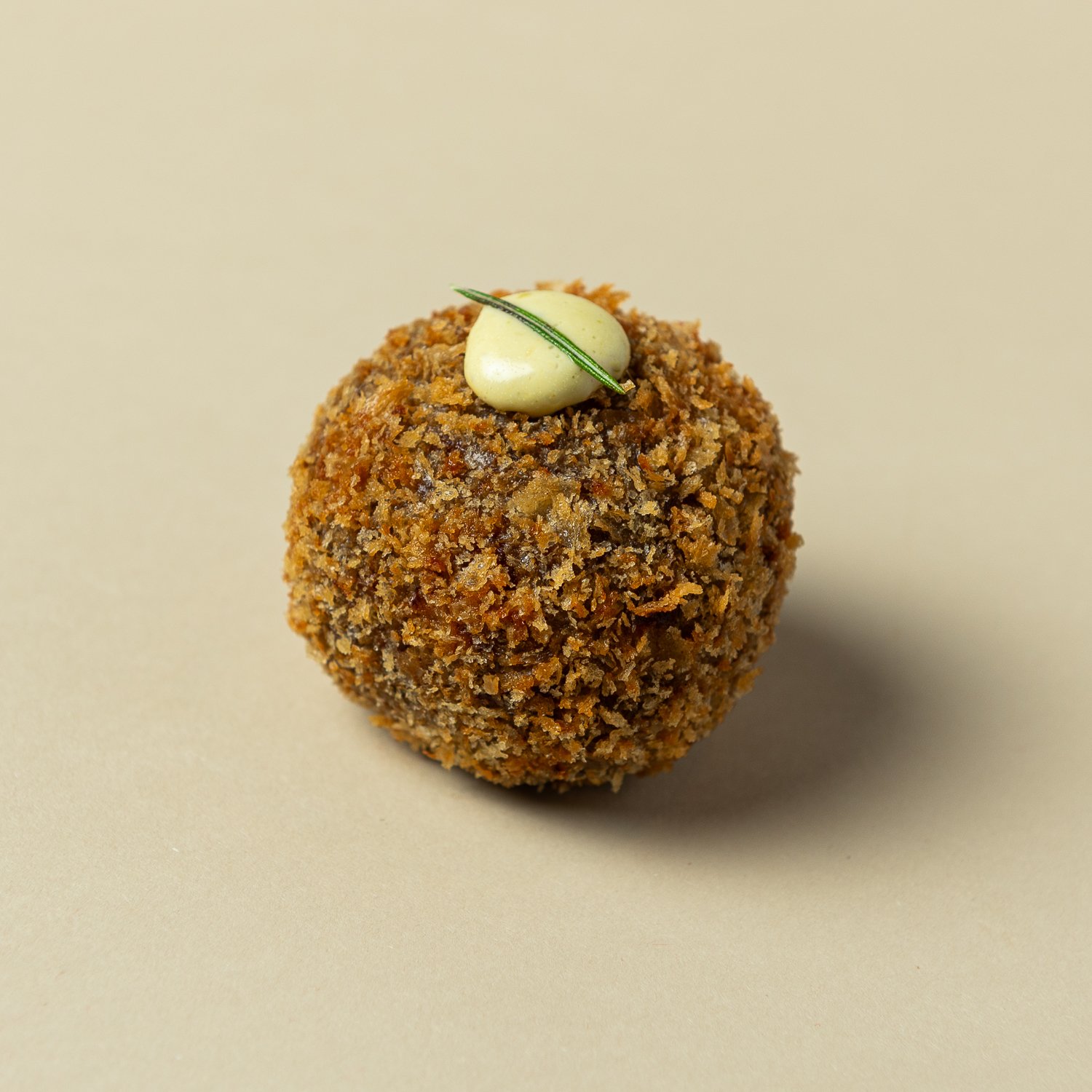 Doble medallón de nuestro blend especial 100% ternera, queso raclette, bits de guanciale, shimeji salteados y mayonesa demiglace.