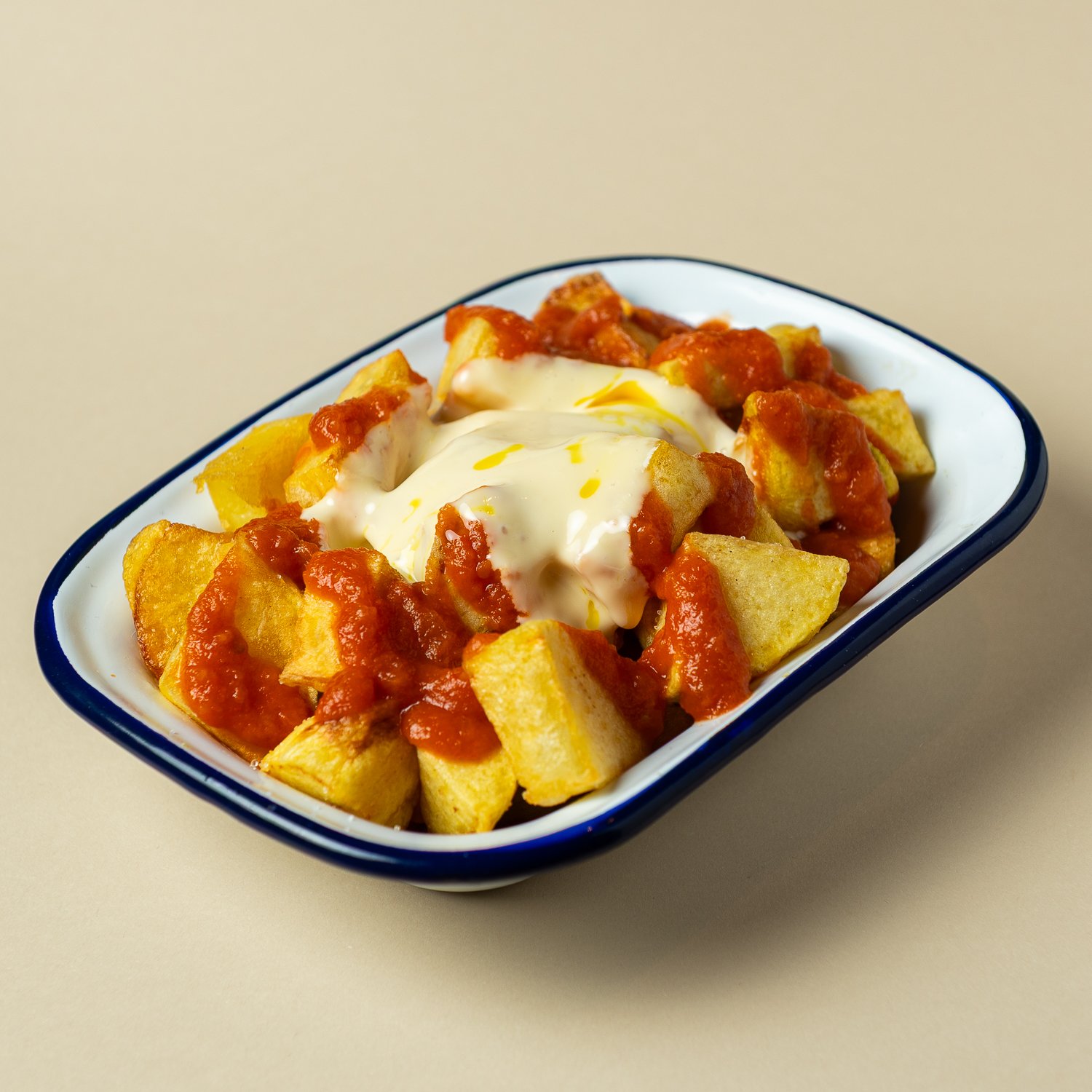 Patata frita cortada a mano, salsa brava elaborada con pulpa de tomate italiano y alioli estilo tradcional elaborado en Festín.